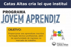 A cidade de Catas Altas acaba de criar o Jovem Aprendiz. O programa vai funcionar por meio de parcerias com entidades sem fins lucrativos, previamente inscritas no Conselho Municipal dos Direitos da Criança e do Adolescente (CMDCA).