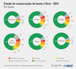 O Brasil tinha 3.299 espécies de animais e plantas ameaçadas de extinção em 2014. Esse número representa 19,8% do total de 16.645 espécies avaliadas nas Contas de Ecossistemas: Espécies Ameaçadas de Extinção no Brasil, divulgadas na quinta-feira (5) pelo IBGE. O estudo analisou os números de espécies ameaçadas nos biomas brasileiros (Amazônia, Cerrado, Caatinga, Mata Atlântica, Pampa, Pantanal e Mar e ilhas oceânicas) e diferentes tipos de ambiente (terrestre, água doce e marinho).