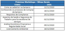 Os futuros workshops abordarão assuntos como conhecer o processo de compras da empresa, análise econômico/financeira, regularidade social, licenciamento ambiental, saúde e segurança do trabalho, dentre outros.