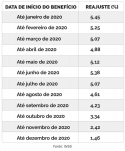 No caso dos benefícios concedidos no ano passado, o beneficiário pode ter direito a um reajuste apenas proporcional, de acordo com o mês em que obteve o direito a receber o pagamento. Confira a tabela: