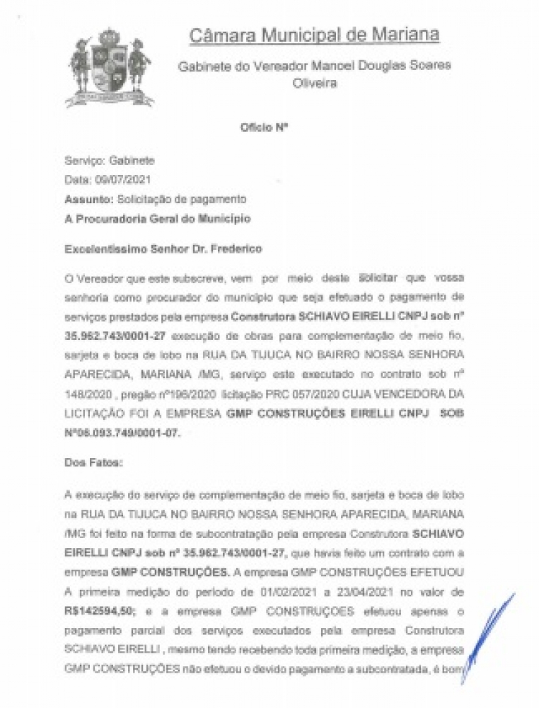 Em 27 de julho de 2021 o Segundo Expoente Dorimar Soares, com muita surpresa recebeu o Ofício 167/2021, oriundo da lavra do Procurador Geral do Município de Mariana Dr. Frederico de Assis Faria noticiando que aquela procuradoria havia sido oficiada formalmente pelo Sr. Manoel Douglas Soares Oliveira, Vereador do Município de Mariana no sentido de solicitar que “seja efetuado o pagamento de serviços prestados pela empresa Construtora SCHIAVO EIRELLI CNPJ sob o nº 35.962.743.0001.07 execução (sic) de obras para complementação de maio fio, sarjeta e boca de lobo na RUA DA TIJUCA NO BAIRRO NOSSA SENHORA APARECIDA, MARIANA, MG”, (GRIFO E CAIXA ALTA NO ORIGINAL), oportunizando a empresa a exercer seu direito a defesa e contraditório, princípios basilares do Estado Democrático de Direito.