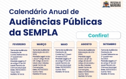 A Secretaria de Planejamento, Suprimentos e Transparência, comunica sobre o Calendário Anual de Audiências Públicas da SEMPLA. O calendário prevê audiências em fevereiro, março, maio, agosto e setembro, as quais estão com seus respectivos temas e datas, que também serão divulgados previamente de cada evento.