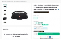 O site falso ‘Loja Estoque Brasil, por exemplo, colocou um grande banner genérico com anúncios de descontos de até 30%. No catálogo do portal, é possível encontrar uma caixa de som JBL Boombox, vendida em geral a preços por volta de R$ 2.000, por R$ 247,99.