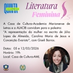 A Casa de Cultura - Academia Marianense de Letras, em colaboração com a ALACIB, anuncia a realização do curso “A Representação da Mulher na Escrita de Júlia Lopes de Almeida, Carolina Maria de Jesus e Conceição Evaristo”, que será ministrado pela acadêmica Giseli Barros.
