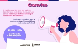 A população de Mariana está convidada a participar da oficina de elaboração do Plano Municipal dos Direitos das Mulheres, que será realizada na próxima quarta-feira (11/03), às 18h, no Centro de Convenções. A iniciativa é organizada pela Subsecretaria da Mulher e Direitos Humanos e busca envolver a sociedade na construção de políticas públicas voltadas à promoção da igualdade de gênero.