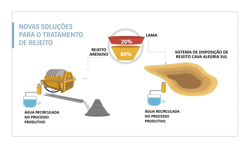 A maior parte do rejeito, que corresponde aos arenosos e representa 80% do total gerado, será filtrada e empilhada a seco. O processo de filtragem permitirá o reaproveitamento de água.